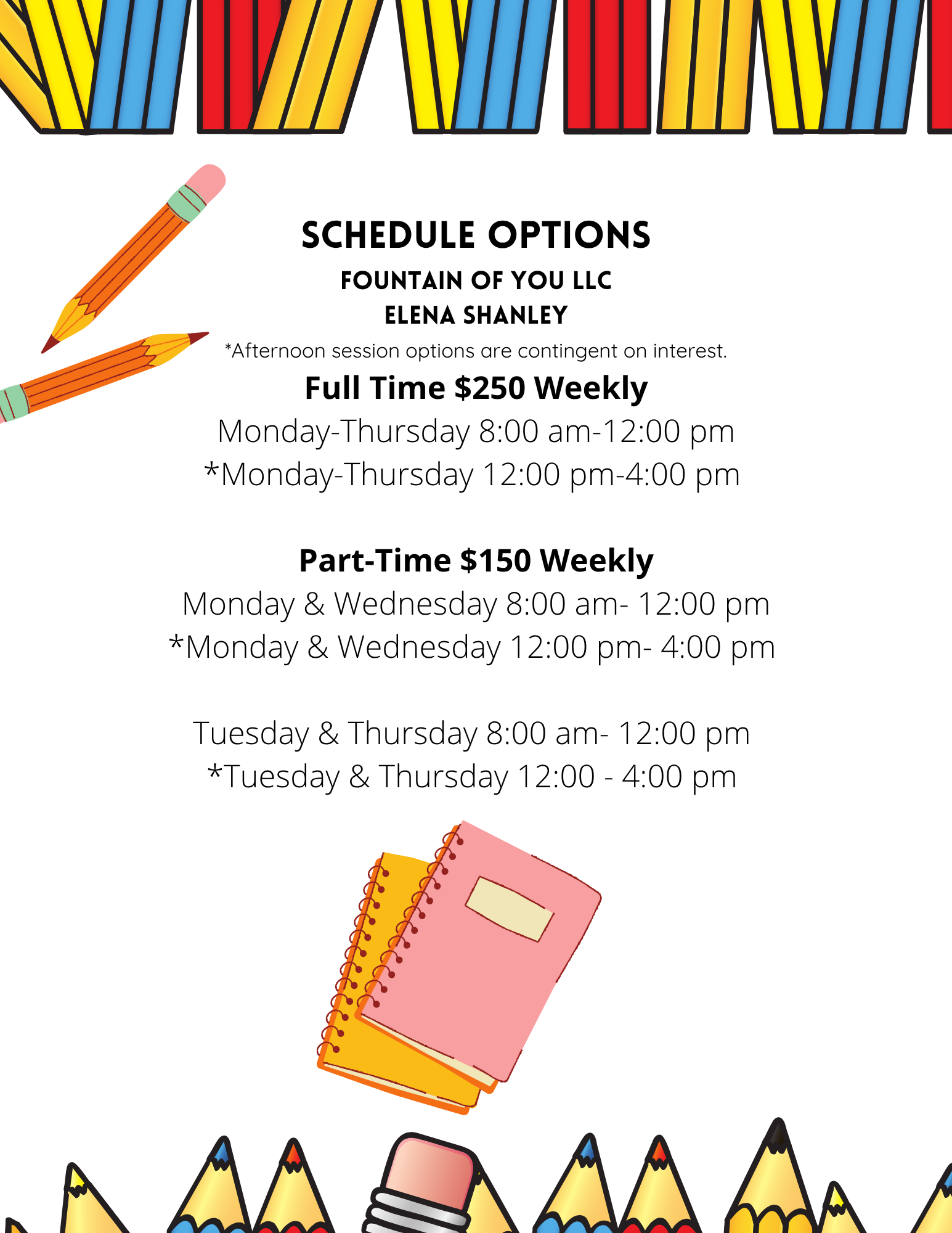 You can choose from full-time to part-time, am to pm schedule. *Tuition is only charged for weeks we are in school. Please note we take one week off each month, no tuition is due the weeks we are out.